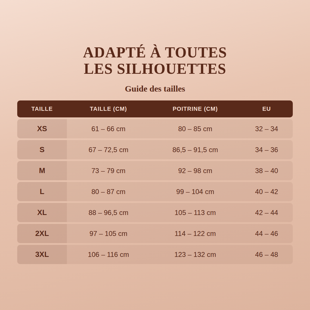Notre guide des tailles est là pour vous aider à trouver celle qui vous correspond. Et si vous avez un doute, notre équipe est à votre écoute pour vous conseiller à contact@nudesparis.com
